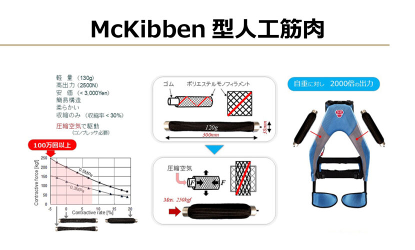 マッスルスーツが採用している「McKibben型人工筋肉」は、EPDMゴムをポリエステルモノフィラメントで覆い、両端を金属部材でかしめた構造になっています。100g程度と軽量ですが、ゴムに圧縮空気を供給することで、自重に対して2000倍以上の収縮力を発生します。独自技術により、人工筋肉両端の直径がΦ28、Φ24の場合2000N(約200kg)の負荷に対して100万回以上の耐久性を確認しています。マッスルスーツでは、この人工筋肉を、上半身の斜めの部分に設置しています。