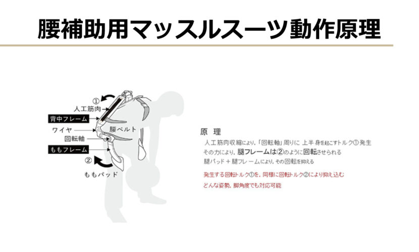 この構造では、膝を曲げずに上半身を起こす動作や、上半身を直立状態にして腰を落として脚の力で物を持ち上げる動作のどちらでも補助ができ、結果として腰や脚への負担を軽減します。