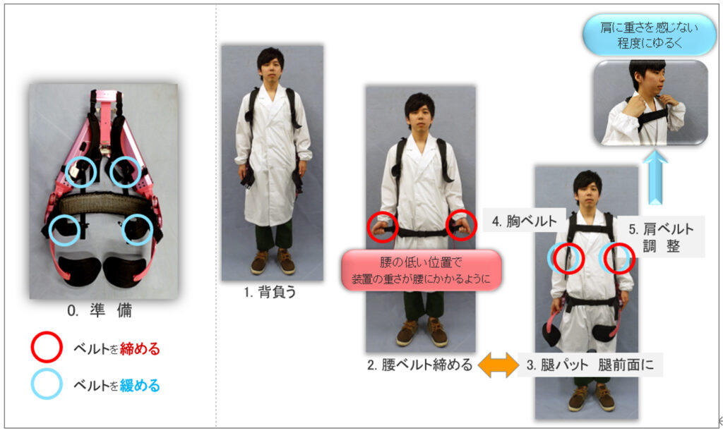 着脱の容易さも重要です。マッスルスーツは、リュックサックのように背負い、腰ベルトを締め、ももパッドを腿の前にもってくるだけなので、慣れれば10秒程度で装着できます。